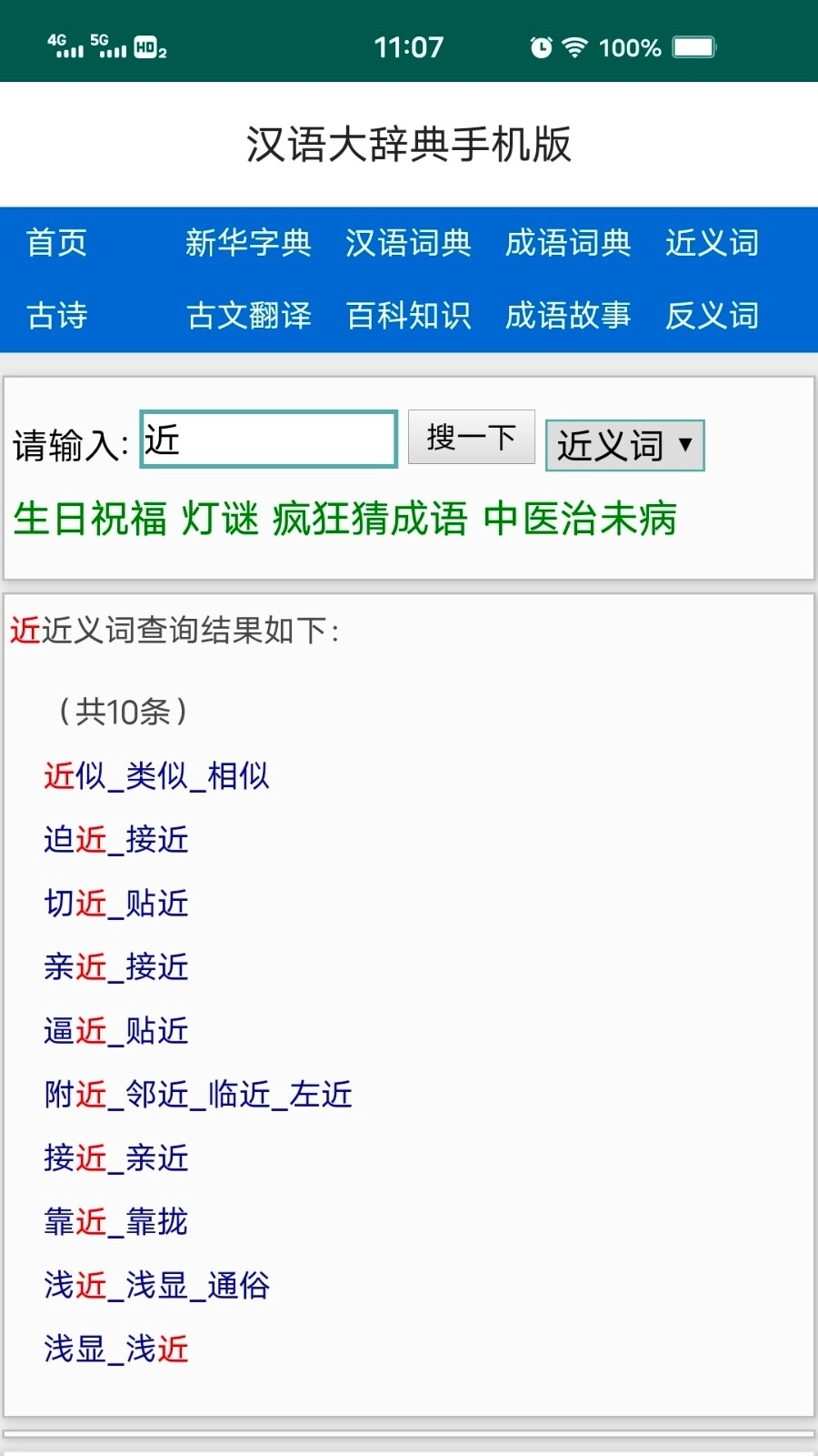 打开软件后,首页会呈现新华字典、汉语词典、成语词典、近义词、反义词、古文翻译、百科知识、成语故事等功能选项,你可依据自身需求从中挑选使用。