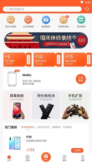 在首页的多数选项里,大致能知晓该产品主要的维修领域,除了常见的苹果、华为和小米设备维修外,还涵盖AirPods、笔记本电脑、台式机、数据恢复、电视机维修等更多品类。此外,你也可以搜索需要维修的设备型号与机型。