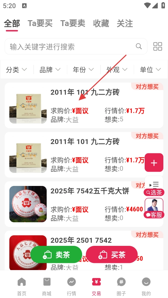 在茶交易页面选定目标茶品,例如“2011年101九二方砖”,随后进入该茶品对应的交易页面。