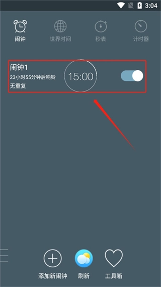 这个时候就可以在改页面看到自己刚刚设置的闹钟了。