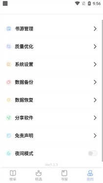 在“个人中心”页面,用户能够对书源设置进行管理、恢复数据备份,还可以切换夜间模式等功能。