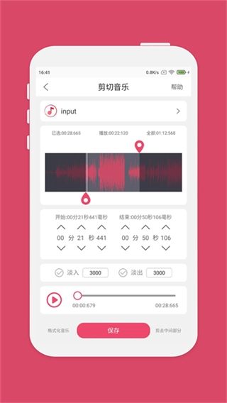 调整音乐的起始点和结束点,完成裁剪后,点击“保存”按钮即可。