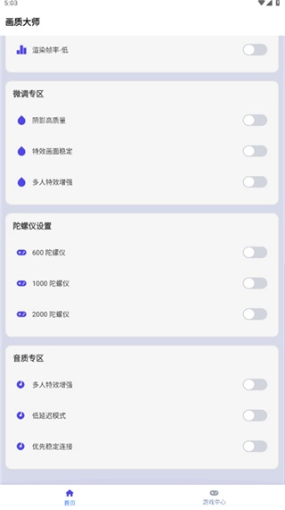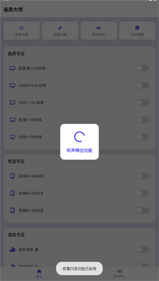 画质大师是一款实用的手机画质优化工具,具备刷新卡顿、修复闪退、听声辨位、一键开启16:9画质等功能,首页设有画质、机型、渲染、微调、陀螺仪、音质六大调节板块。用户只需选择对应机型,再依据自身需求挑选合适参数进行设置,即可将手机画质调整至理想状态,操作便捷且效果出色。