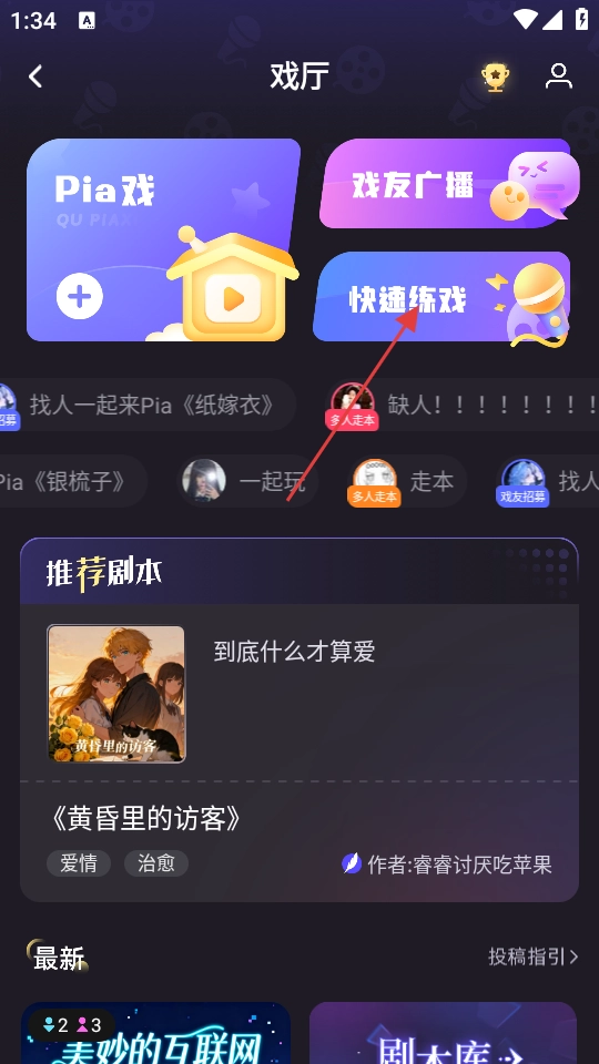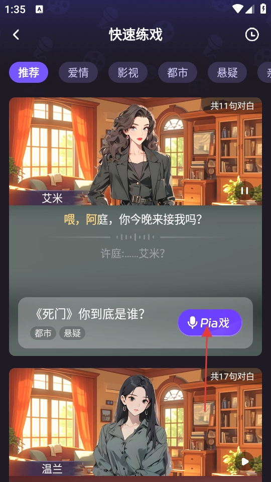 在快速练戏页面选定剧本后,点击紫色的【Pia戏】按钮,即可进入剧本演绎的准备阶段。