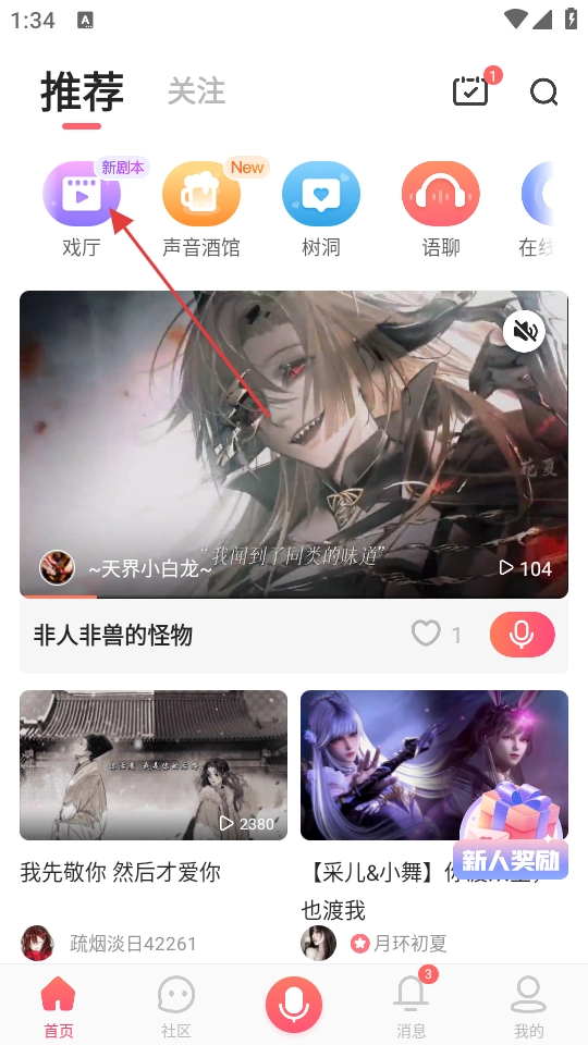 在推荐页面点击【戏厅】图标,进入戏厅板块。