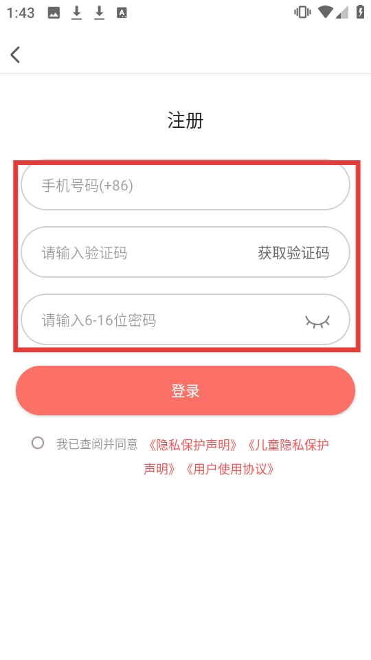 在注册页面依次填写手机号码、验证码以及6-16位的密码,勾选同意相关协议后点击登录按钮,就能完成注册并同步登录账号。