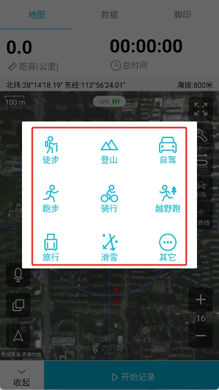 点击“开始记录”按钮后,挑选轨迹类型,像登山、徒步、自驾、跑步之类的;