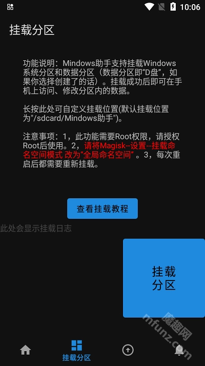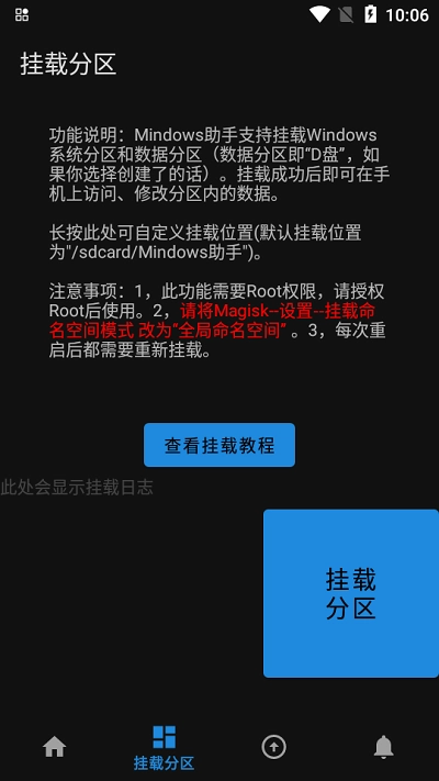然后打开,授权Root后点击“挂载分区”按钮。若出现右图所示的提示,即表示操作成功。