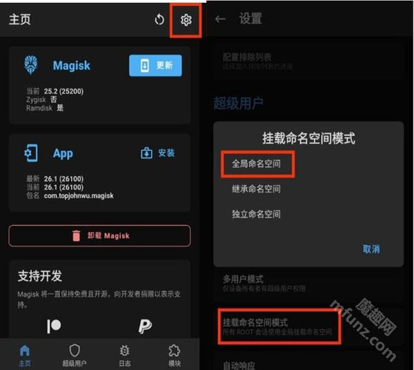 首先把Magisk的“挂载命名空间”模式调整为“全局命名空间”。