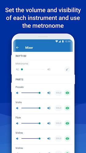 - 调整每个乐谱中每个乐器的音量和可见性。