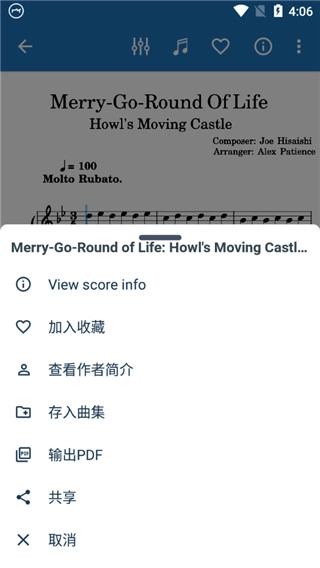 还能查看作者信息,把曲目存进曲集,导出成PDF,也可以开展分享操作。