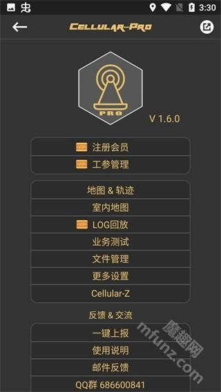更多功能涵盖会员购买、信息查看、工参管理、地图轨迹、测试文件记录、反馈及使用说明等。会员类型分为普通会员与高级会员,其中高级会员可享有更丰富的功能权限,例如详细信令的查看与导出、工参导入、轨迹导出以及不限时的业务测试等服务。