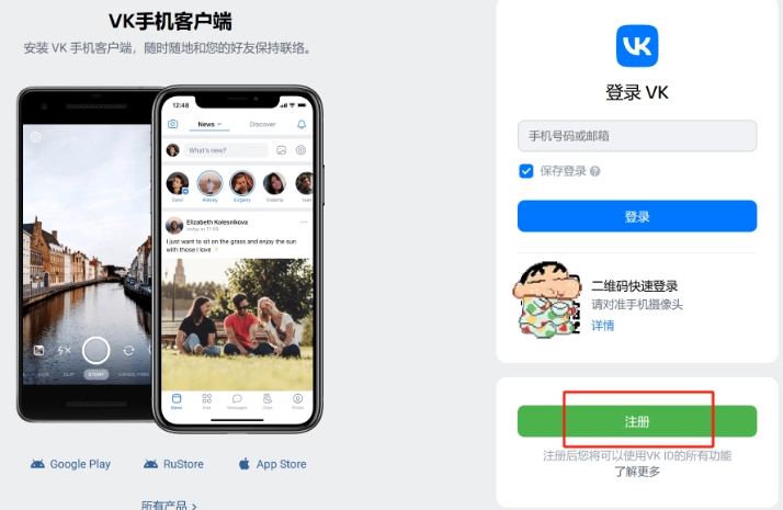 在浏览器的搜索框中输入vk.com并访问该网址,页面随即跳转至注册登录界面。
