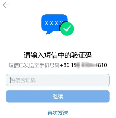 点击“继续”按钮后,页面会跳转至验证码输入环节,此时需要填写短信收到的验证码内容。