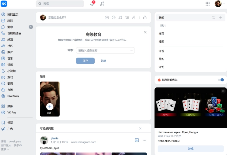 vk社交平台,VK是俄罗斯本土的社交平台,在当地十分受欢迎,它融合了微博和微信的特点,用户既能浏览新闻也能结交朋友。由于其设计风格和功能与Facebook高度相似,VK也常被称作“Facebook的克隆版”。