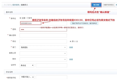 请填写好该子账号的相关信息,然后确认新建就可以了;“使用者手机”这一栏,请填写使用该子账号的用户的手机号码信息。