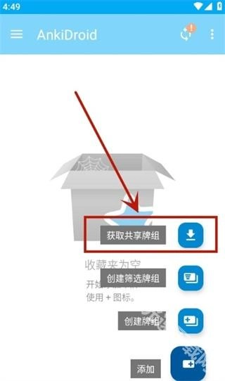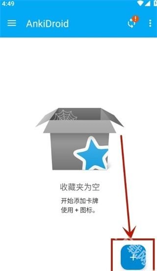 然后安装AnkiDroid,安装完成后打开该软件,点击右下角的加号图标