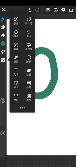 画世界Pro左侧的单行工具栏从上到下依次排列着这些功能:“画笔工具”、“涂抹工具”、“橡皮擦工具”、“调色盘”、“柳叶笔”、“剪切/复制”、“变形工具”、“文字工具”、“工具箱”、“液化工具”、“移动工具”、“滤镜”、“填充工具”、“吸管工具”、“动画制作”、“导入图片”、“参考图片”、“对称工具”、“透视网格”以及“特殊工具箱”。在工具栏的下方,还设有可以调节笔刷“大小”与“不透明度”的进度条。