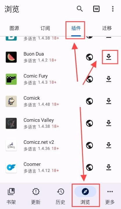 安装后,点击图源,点击安装的插件就能看漫画了。