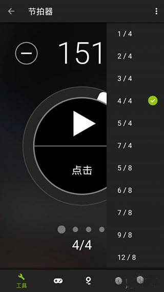 使用节拍器功能时,可对节拍器的速度与拍数进行选择,点击播放按钮即可启动其工作。