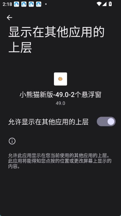 打开已安装完成的小熊猫49.0版本辅助工具,然后在系统设置里授权它能够显示在其他应用的上层界面,也就是开启悬浮窗权限。