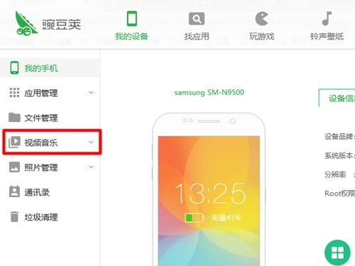 步骤2:待手机与电脑成功连接后,在左侧菜单栏中找到【视频音乐】这一选项