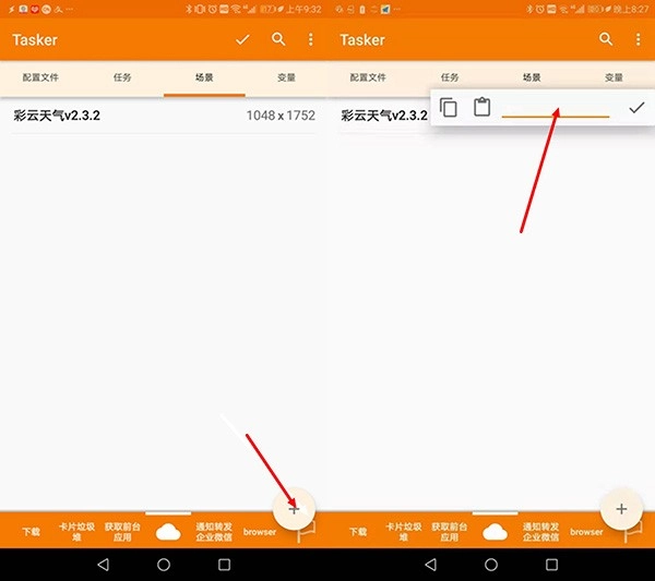 在Tasker主界面点击场景选项卡,切换至场景查看与制作界面,接着点击右下角的“+”按钮新建场景,设置好场景名称后便会自动进入场景设计界面。
