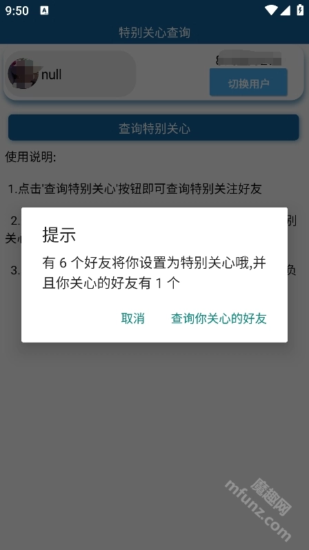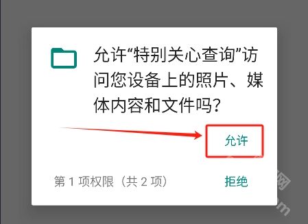 首先前往魔趣网(m.mfunz.com),找到并安装特别关心查询软件,安装完成后点击“允许”授予软件所需权限,即可进入下一步操作。