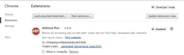 接下来点击屏幕左侧的“扩展”标签页,此时右侧窗口会展示Google Chrome的扩展程序,从中找到Adblock Plus。