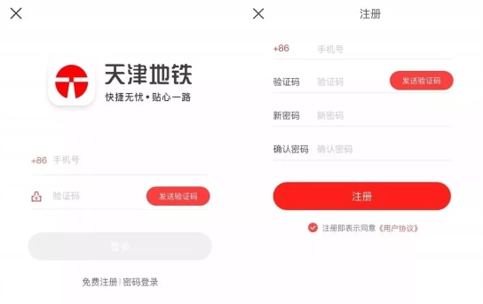 之后,在“天津地铁”的首页,通过手机号加验证码的方式完成快速注册。