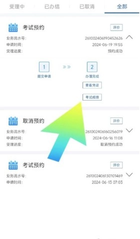 点击“网办进度”,可查看所有正在办理或已办理的业务,像考试预约等都包含在内。