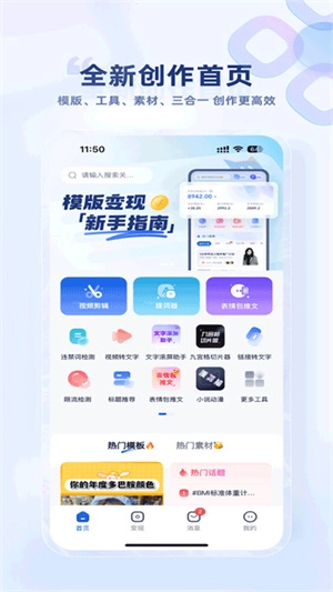 针对各类变现场景配备了丰富多样的视频模板,用户仅需替换相应素材,就能一键制作出同款视频,通过发布推广来获取收益。