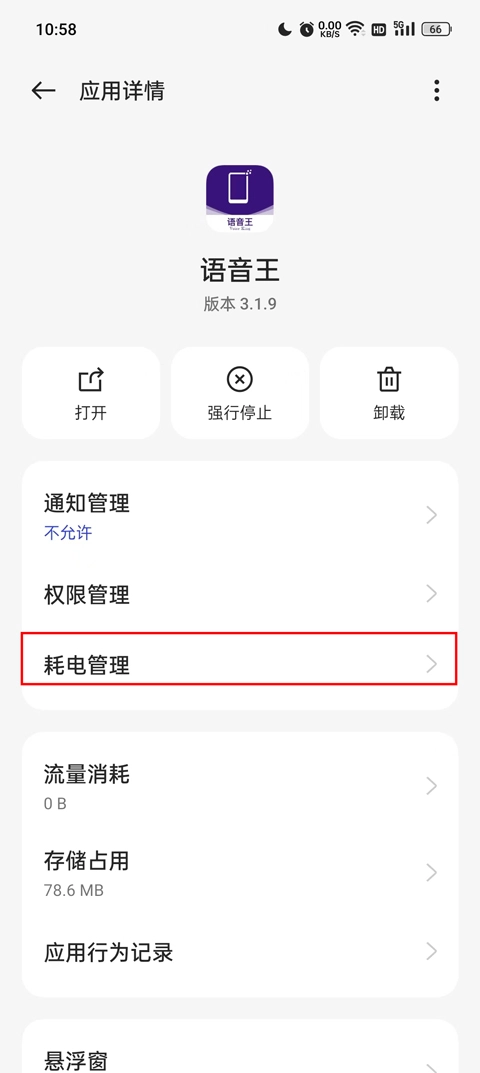 找到电池优化选项后,会进入语音王应用的详情页面,接着点击耗电管理选项进入即可。