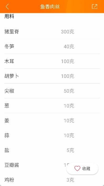 点击进入鱼香肉丝的详细页面,就能看到所需的食材清单和对应的数量。