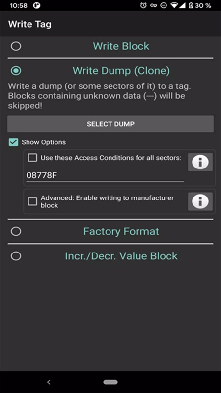 勾选刚才保存好的标签,选好之后点击软件底部的“选择转储”按钮进入下一步(需要注意的是,这时候要把CUID空白卡放在手机的NFC感应区域内)。
