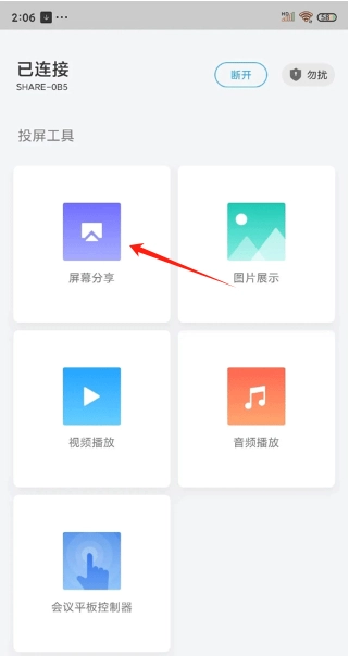 连接成功后,点击“屏幕共享”功能即可开始投屏。