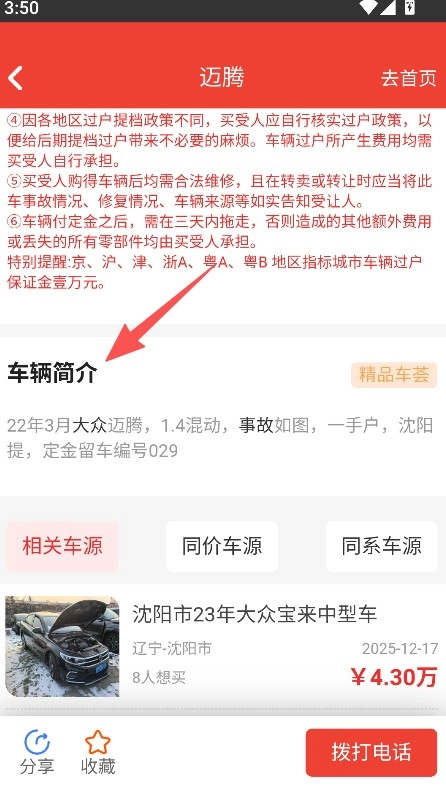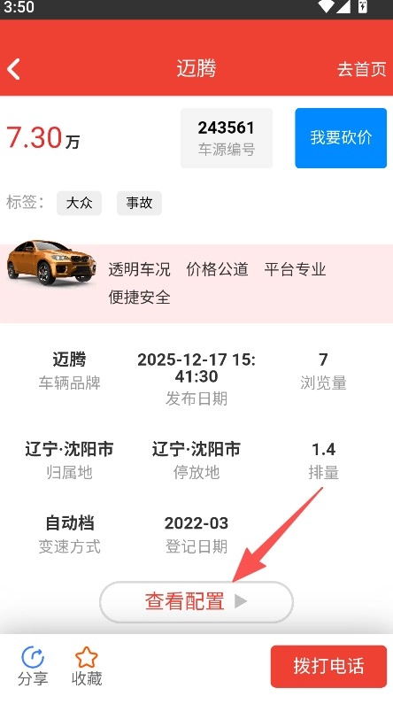 在车辆详情页面点击“查看配置”选项,也可以通过查看车辆简介来了解车辆的相关信息。