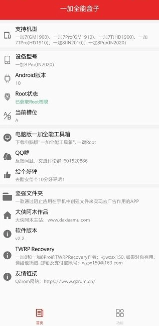 打开一加全能盒子后,在首页能看到支持机型、当前槽位等诸多信息,可供用户了解。