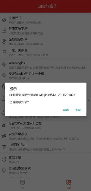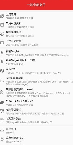 一加全能盒子是大侠阿木原创的手机实用工具,能帮你轻松完成手机刷机操作,功能十分强大,堪称一加手机用户的装机首选。它不仅支持一加无限制双开,还可禁用或恢复系统更新功能,若有安装相关需求,也能实现一键安装。