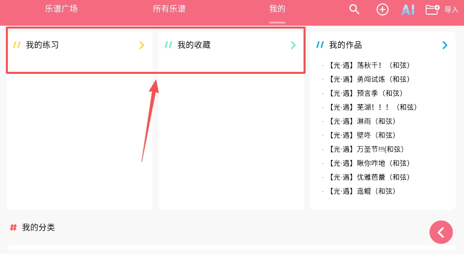 请记得在乐谱广场的“我的练习”里管理自己的作品和收藏哦。由于乐谱是存在手机本地的,要是卸载软件就会丢失,所以一定要及时导出做好备份呀。
