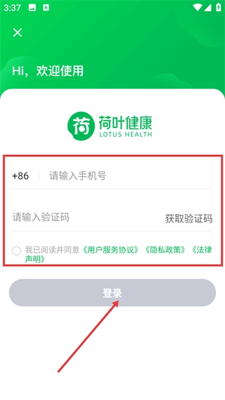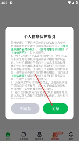 打开荷叶健康后,阅读《荷叶健康隐私政策》和《用户服务协议》,点击【同意】按钮,就能使用该软件的服务了。