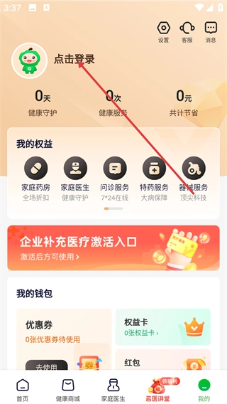 进入软件首页后,点击底部的【我的】按钮,就能进入个人页面,在那里可以查看健康守护、我的钱包等各项功能。