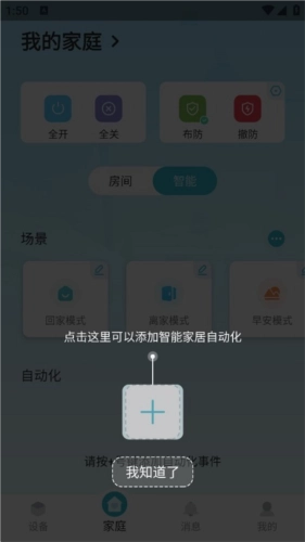 点击此处可添加智能家居自动化功能,像定时执行、触发执行这类功能都能实现。