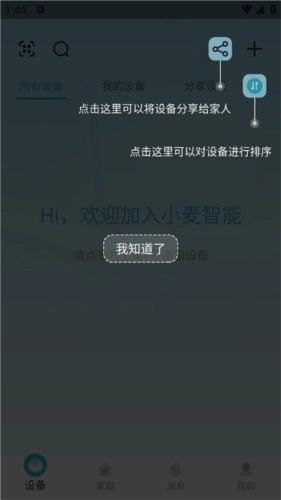 点击图中的分享图标,就能把设备分享给家人;点击下方的排序按钮,则可以调整设备的位置顺序。