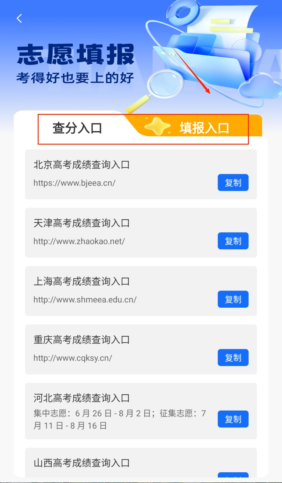 安装完成后,用户选择自己所在的省份,系统会自动适配当地的招生政策,并构建起一个个性化的院校信息库,其中涵盖了近五年录取分数线等重要内容。
