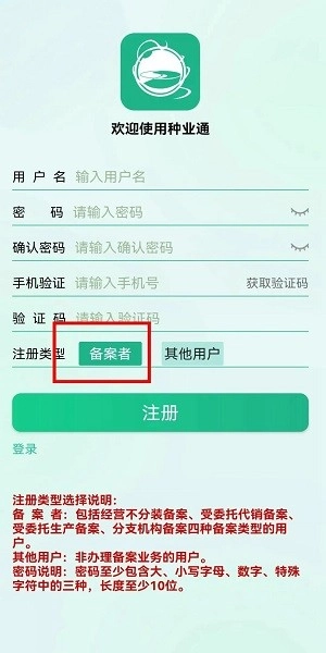 接着填写用户名、密码、手机号与验证码,注册类型选择“备案者”,然后点击“注册”按钮。