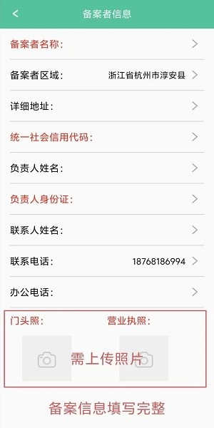 接着填写“备案者信息”,其中涵盖区域、详细地址、统一社会信用代码、负责人身份证等内容,并上传营业执照。