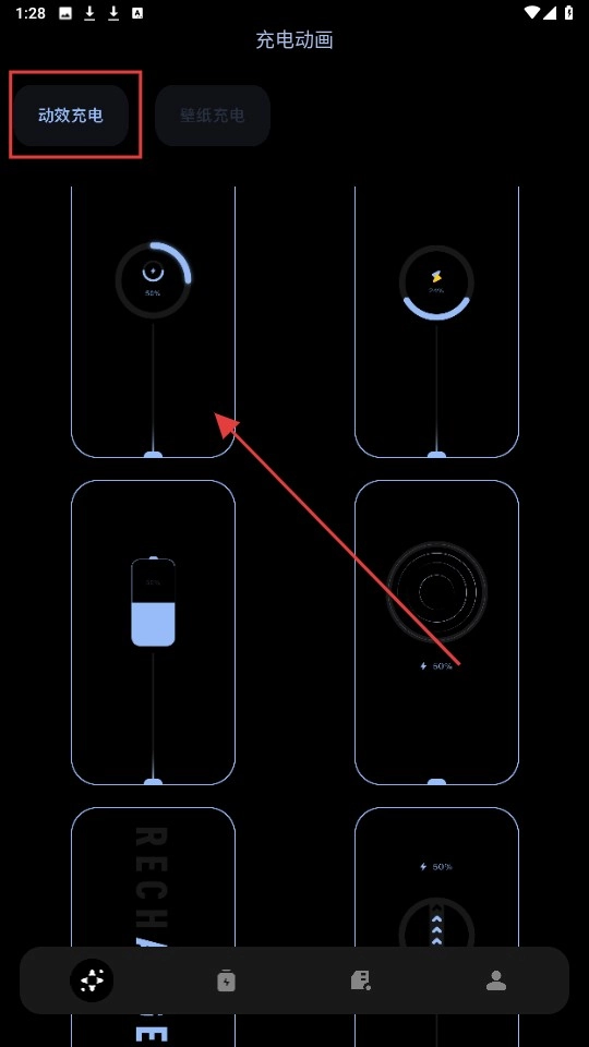在充电动画设置页面,点击【动效充电】选项,就能查看动效类的充电动画内容。