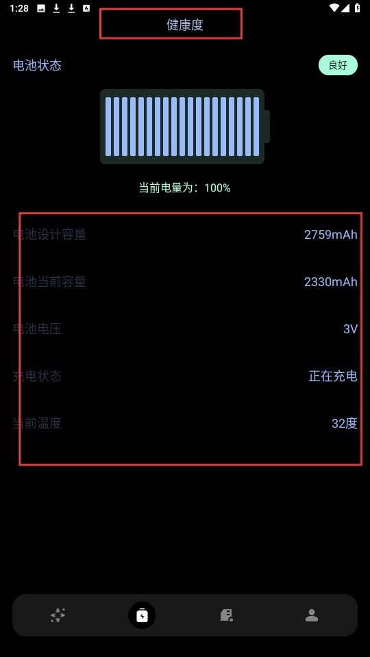 在应用的健康度页面,你能够查看电池状态、电量等详细信息。