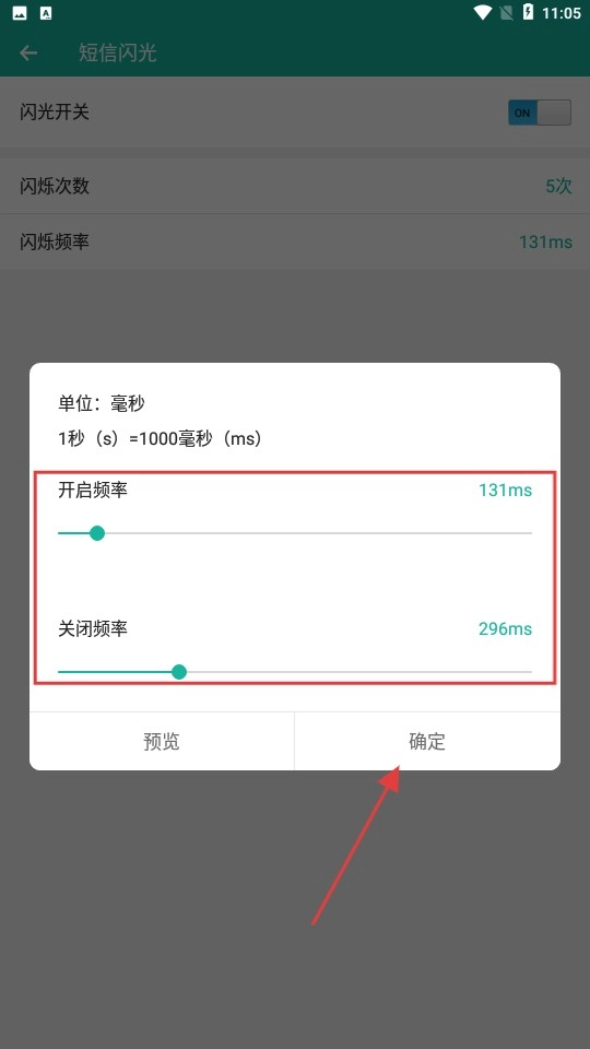 在短信闪光设置页面,调整闪烁频率等参数后,点击【确定】按钮保存设置。